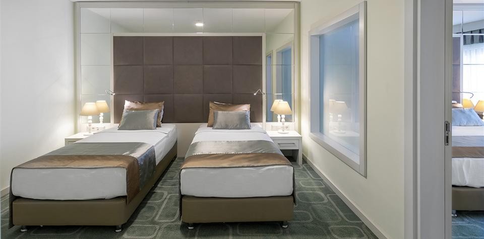 * Suit Odalar: toplam 45 adettir. 45-73 m², 3 kişi kapasiteli, bahçe veya havuz manzaralı, 2 odalı, ara kapılı, french ve twin yataklı ve tek banyoludur. Odalar banyoda duşlu küvet veya duş ve telefon, minibar, saç kurutma makinesi, direkt hatlı telefon, uydu yayınlı lcd tv, emanet kasa, laminant zemin, merkezi klima (hava durumuna göre belirli saatlerde) mevcuttur.