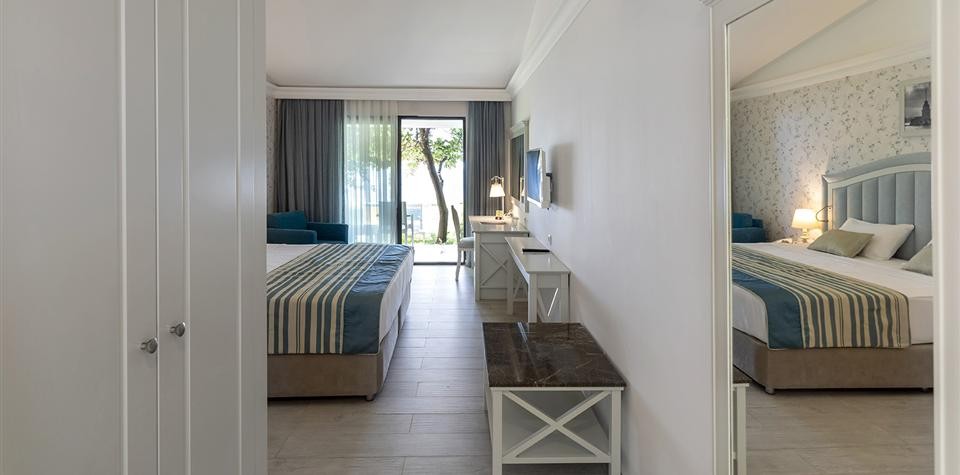 * Bahçe Aile Oda: Bahçe odası ile aynı konfora sahip bu odalar 21 adettir. 2 yatak odalı, ara kapılı, french ve twin yataklı, 44 m², 4 kişi kapasiteli, bahçe manzaralı ve tek banyoludur.