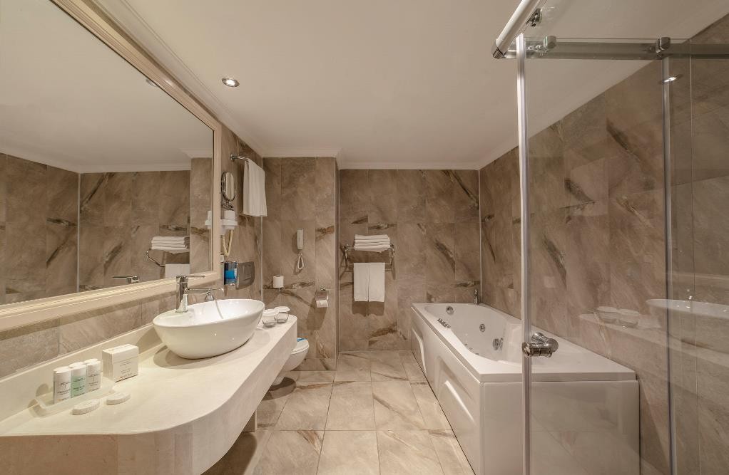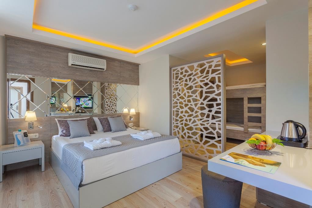 Senior Suit Oda: 8 Adet / 62 m² / Max. 4 yetişkin konaklama (2 Yatak odası, 1 Salon, 1 Banyo) 1.oda Çift kişilik yatak, 2.oda 2 adet tek kişilik yatak ve salonda çekyat bulunmaktadır. Banyoda Jakuzi bulunmaktadır.